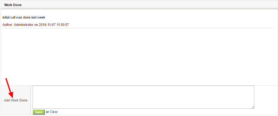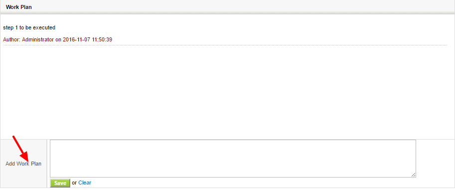 You can add notes for your Work Plan and Work Done. Notes added are visible along with the author's name and date as shown in the image below.