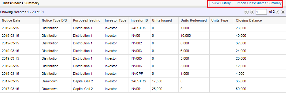 This tab contains Drawdown / Distribution history and allows users to Import Drawdown Distribution, Units/Shares Summary and Download report in excel Portfolio Level - Investor Contribution and another tab Fund Level (underlying) Investor Contribution.