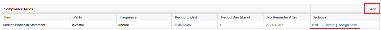 Compliance Rules can add, Edit or Delete using links in the Action column.