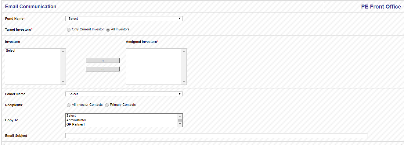 Select Funds Invested, Choose Target Investors either Only Current Investor or All Investors. Choose Recipients either All Investor Contacts or Primary Contacts.