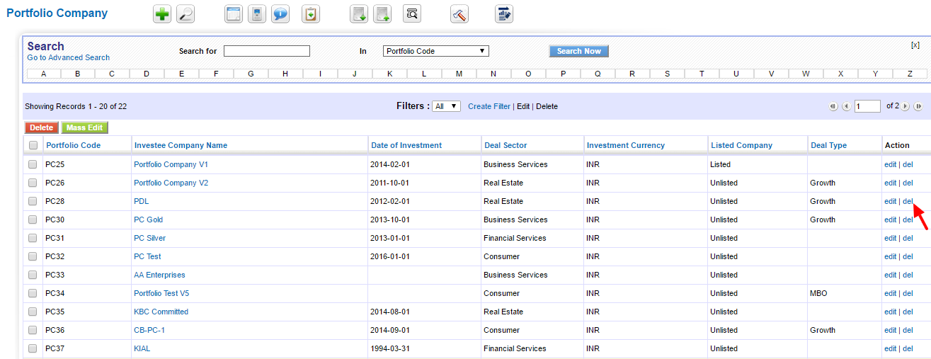 Help Center > null > Manage Records in Portfolio Company > Delete a Portfolio Company Delete a Portfolio Company Delete a Portfolio Company Manage Records of Portfolio Company To delete Portfolio Company Click on Portfolio Company option in the main menu. In the Portfolio Company list view, click delete under action.