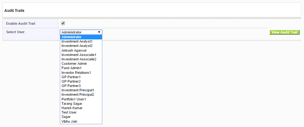 - Select a user from Select User picklist and click on View Audit Trail button.