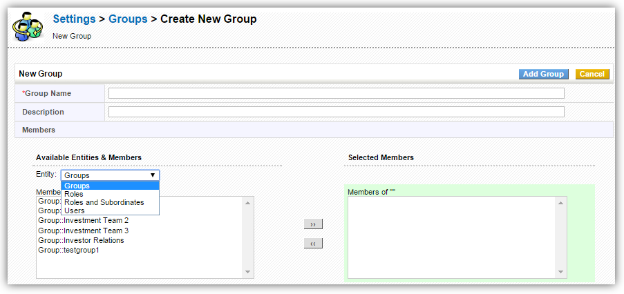 - Provide the Group Name (mandatory), Description and select its Members from the available Entities and Members.
