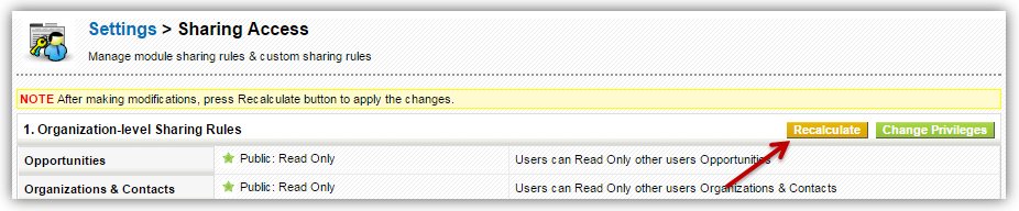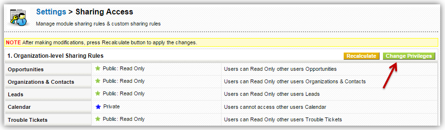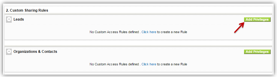 - Scroll down to Custom Sharing Rules section and click Add Privilege button next to module.