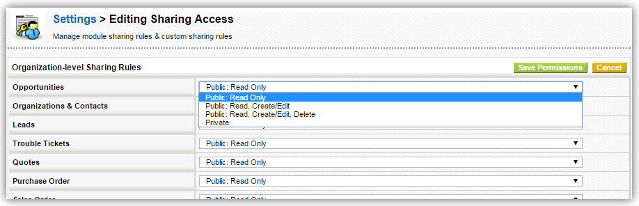- Module list with permission dropdown next to each will appear.