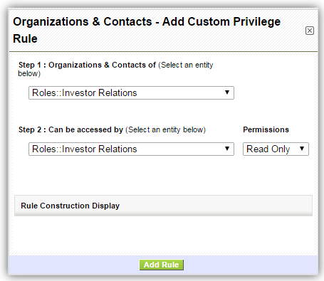 Sharing Rules are used to configure data sharing rules across users in role hierarchy. In PE Front Office, the default access for CRM records is set to public, which enables everyone to see all records. When sharing rules are set to private, users can only view records assigned to them and records of users below them in role hierarchy. Sharing Rules also help you to set custom sharing rules to share data with specific role, role and subordinate, and group.