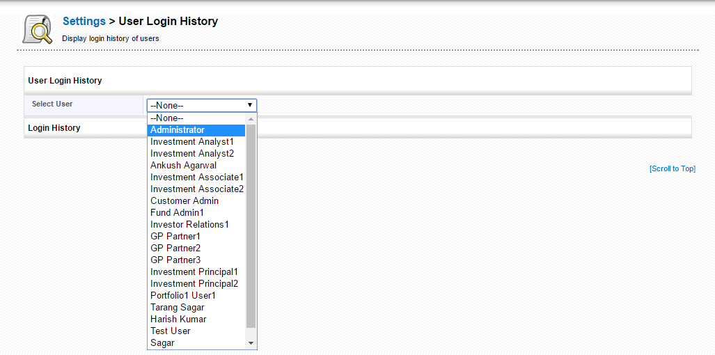 - Login details of the user can be displayed on selecting a user from Select User dropdown.