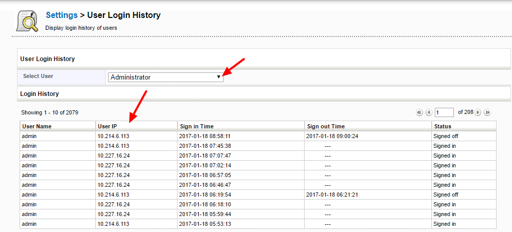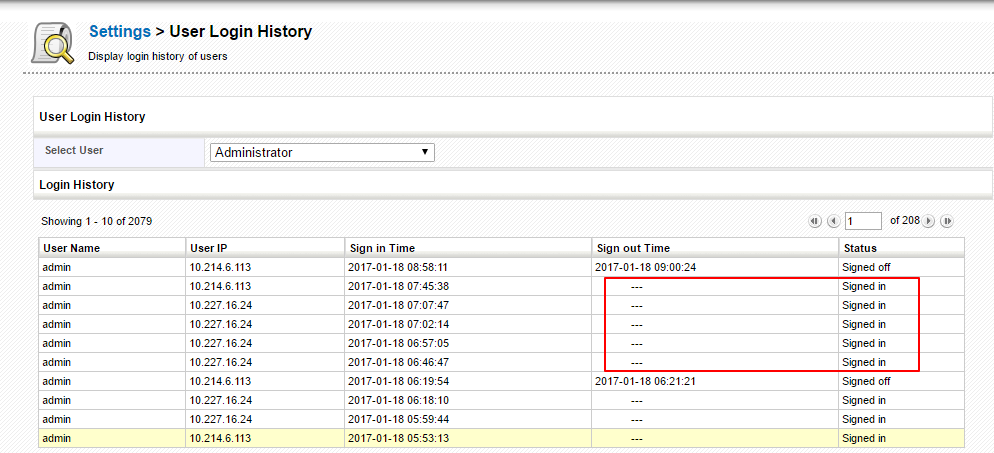 - The results can be displayed under five columns namely User Name, displays user name of the user; User IP, displays user IP address; Sign In Time, displays sign in time of the user; Sign Out Time, displays sign-out time and Status, displays user login status.
